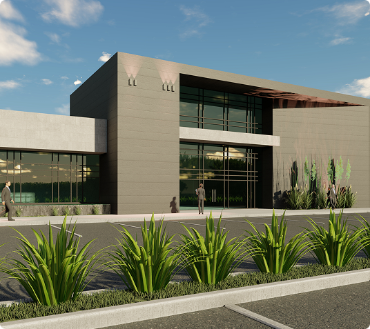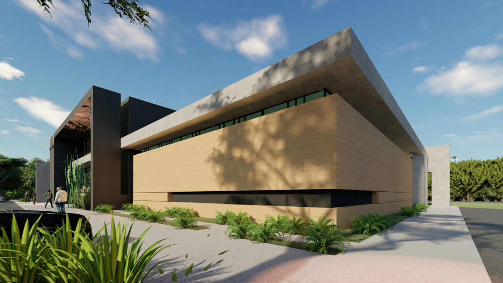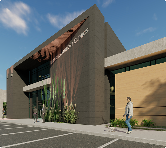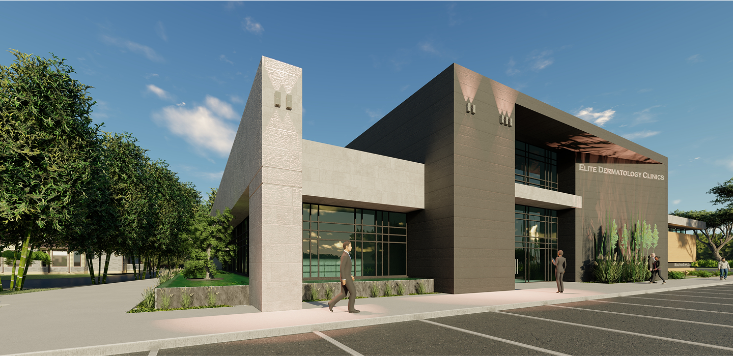 Elite Dermatology Clinic is a 13,000 sq. ft. medical facility situated on a 2.9-acre site, designed with a focus on modern elegance and functionality. The building features high-end finishes like honed travertine stone, concrete-faced porcelain tiles, and fiber cement board on its exterior, complemented by large glass curtain walls. An infinity-edge water feature adds to the building’s aesthetic, creating a tranquil atmosphere that blends seamlessly with the clinic’s purpose of providing premium dermatological care.